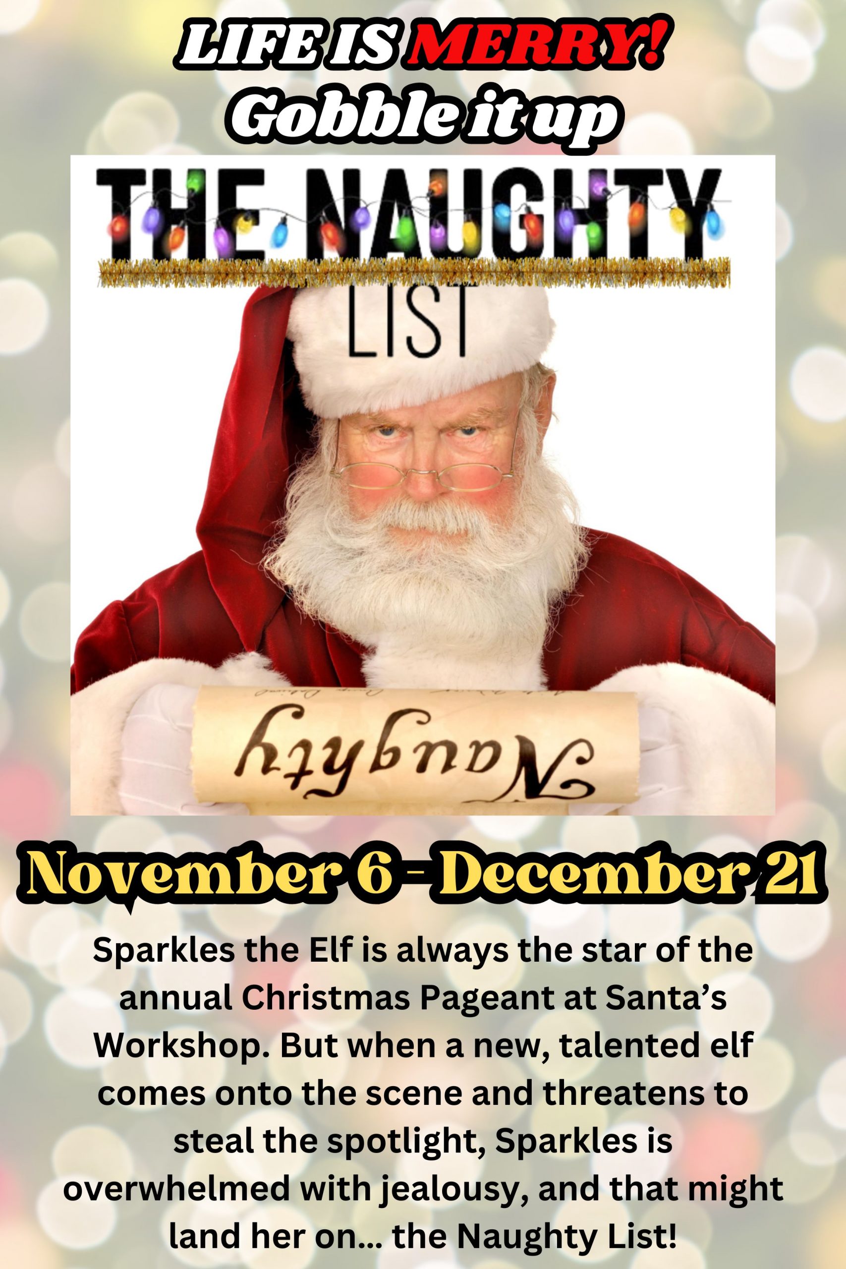 The final show of Cornwell’s Dinner Theatre’s 2025 season, THE NAUGHTY LIST, is now open and playing through December 21, 2025! When Sparkle the Elf is faced with a new star taking her spot in Santa’s Holiday Christmas Spectacular, she gets so jealous that she finds herself on a certain not-so-Christmassy list. Bring the whole family out to Turkeyville to